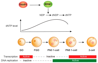 Fig 1. THAP1 ensures adequate dNTP supply for the first cell cycle after fertilization by transcriptionally activating the downstream gene Rrm1, thereby supporting the 1-cell to 2-cell transition and ZGA.