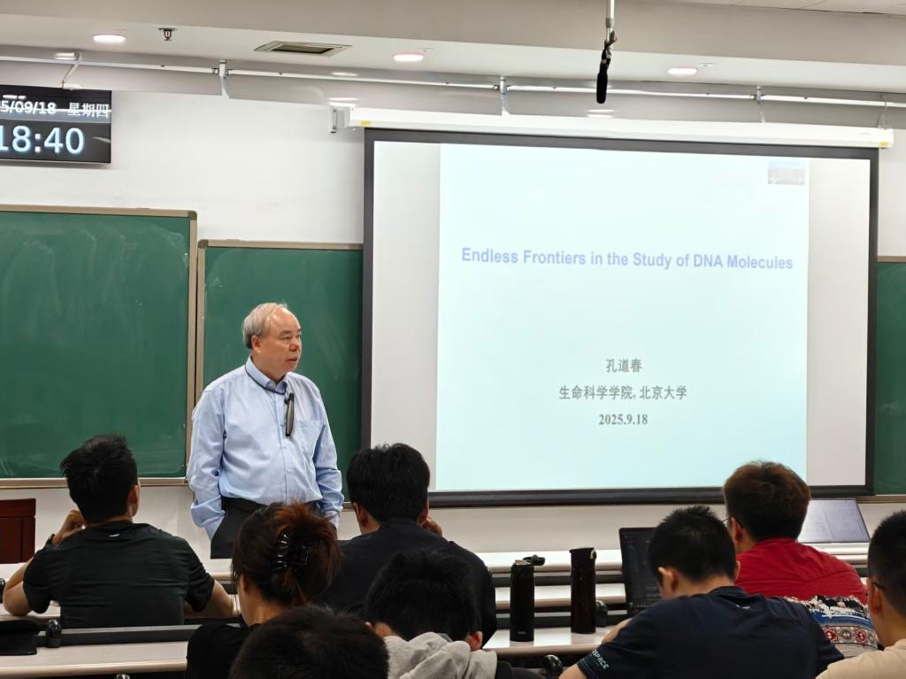 2025年9月18日,孔道春教授为25级新生开展一场题为《Endless Frontiers in the Study of DNA Molecules》的精彩讲座,系统梳理了近年来DNA复制调控与基因组稳定性维持机制方面的突破性发现。孔道春教授以幽默风趣的方式向同学们娓娓道来,使同学们在轻松的氛围中收获满满。