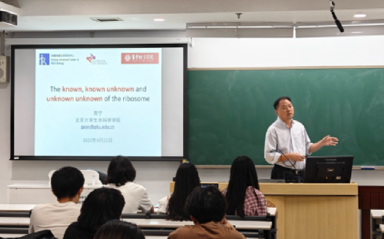 2025年9月25日,高宁教授为25级新生开展了一场题为《The known, known unknown and unknown unknown of the ribosome》的精彩报告,围绕核糖体的发现历史、结构研究进展及其翻译过程中的未知机制展开,强调尽管已有高分辨率结构,但其功能调控仍存在大量未解之谜。