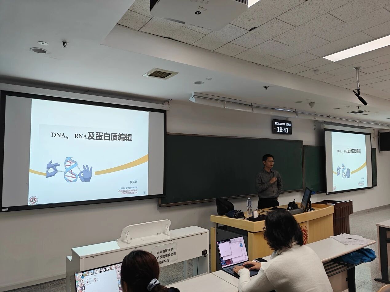 2025年10月9日,伊成器教授为25级新生开展一场题为《DNA、RNA及蛋白质编辑》的精彩讲座,围绕基因编辑技术的发展历程、科学逻辑与前沿应用展开,重点探讨了DNA、RNA及蛋白质层面的编辑技术及其背后的科研思维与伦理挑战。
