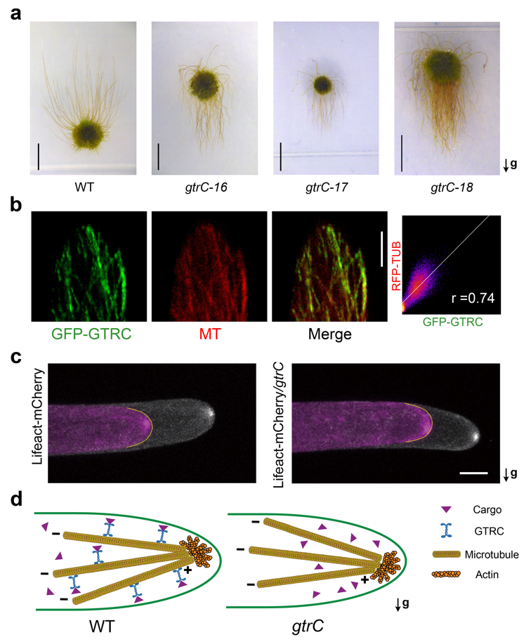 (a)黑暗中,野生型(WT)小立碗藓原丝体向上生长,gtrC突变体原丝体向下生长。(b)GTRC定位于原丝体顶端细胞的微管上。(c)重力刺激时微丝在顶端细胞中的分布。紫红色与灰色分别代表间隔30分钟的两个时间点下收集的荧光信号,两张图像的叠加展示了细胞的延伸方向。左图为野生型,右图为突变体。(d) GTRC参与苔藓原丝体向重力性调控的模型。原丝体偏离重力方向发生重力刺激时,GTRC沿微管向负端运动运输未知货物,导致微丝在顶端细胞的上侧聚集从而引起负向重力性向上弯曲生长;gtrC突变体中微丝则在下侧聚集,导致顶端细胞正向重力性向下弯曲生长。