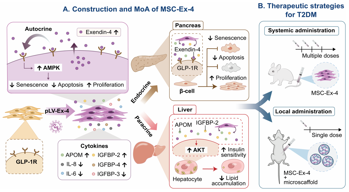 为了增强MSCs针对T2DM的疗效,清华大学杜亚楠研究团队利用慢病毒感染体系对人脂肪来源的MSCs进行Exendin-4的基因修饰(MSC-Ex4),Exendin-4是胰高血糖素样肽-1受体激动剂(GLP-1RAs)家族中的一员,已经在临床上批准用于治疗T2DM。然而Exendin-4作为只有39个氨基酸的多肽,极易被肾脏清除,在体内半衰期只有半天。本研究中,研究人员发现注射MSC-Ex-4小鼠体内Exendin-4浓度达峰时间可显著延长,实现了Exendin-4的长效释放。并且由于MSC内源表达Extendin-4的受体GLP-1R,因此MSC-Ex-4可通过自分泌效应增强自身在糖尿病高糖环境下的存活和疗效,同时其分泌的其他活性因子可通过内分泌作用保护胰腺β细胞,并通过旁分泌作用改善肝细胞胰岛素敏感性,减少肝细胞脂质积累(图1)。