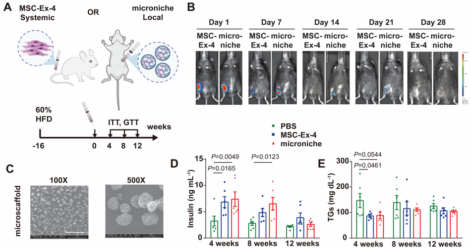 最后,研究团队利用3D多孔明胶微支架(微载体)对MSC-Ex-4细胞进行包裹和体内递送。该多孔微载体相关技术为课题组前期开发,可作为干细胞生长的微环境(microniche) 辅助高效干细胞治疗, 并且由北京华龛生物科技有限公司进行了转化和商品化, 相关明胶微载体产品分别获批中国药监局首款细胞用药用辅料资质和美国FDA首款细胞用DMF药用辅料资质。在此明胶微载体的辅助下,单剂量皮下注射可进一步延长MSC-Ex-4在体内的存活时间至一个月。而血清胰岛素、甘油三酯(TGs)水平以及葡萄糖耐量等指标也显示该微载体作为细胞药剂可增强MSC-Ex-4治疗效果达两个月以上。这些发现为MSC-Ex-4和明胶微载体联用改善包括糖尿病和代谢相关脂肪性肝病(MAFLD)在内的代谢功能障碍疾病以及其他相关并发症(如糖尿病足,糖尿病严重下肢缺血等)提供了新的策略和方法(图4)。