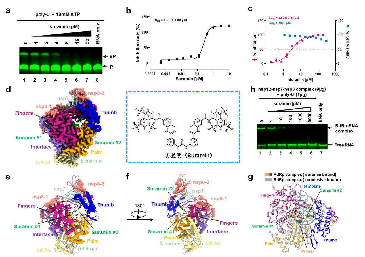 a,Gel-based实验结果;b,荧光实验测定IC50;c,细胞水平抑制病毒复制的EC50;d,苏拉明结合新冠病毒RNA复制酶复合物的电子密度图;e-f,苏拉明结合新冠病毒RNA复制酶的结构;g,苏拉明结合新冠病毒RNA复制酶的位点;h,凝胶迁移功能实验。