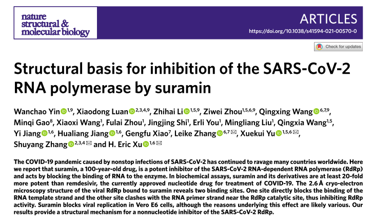 2021年3月5日,生命中心PI张抒扬课题组联合中科院上海药物所徐华强课题组、余学奎课题组以及中科院武汉病毒所张磊砢课题组在新冠重要药靶RNA复制酶研究领域取得重大进展——首次解析了新冠病毒基因复制酶结合百年老药苏拉明复合物的冷冻电镜结构,分辨率为2.6埃,这也是国际上第一个解析的非核苷类抑制剂结合新冠病毒RNA复制酶的三维结构。该研究成果以长文的形式在线发表于国际著名期刊《自然-结构与分子生物学》(Nature Structural & Molecular Biology)。