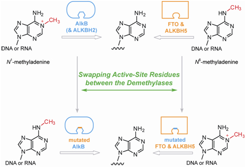 互换活性位点关键氨基酸,实现AlkB、ALKBH5及FTO去甲基化酶的活性互换。