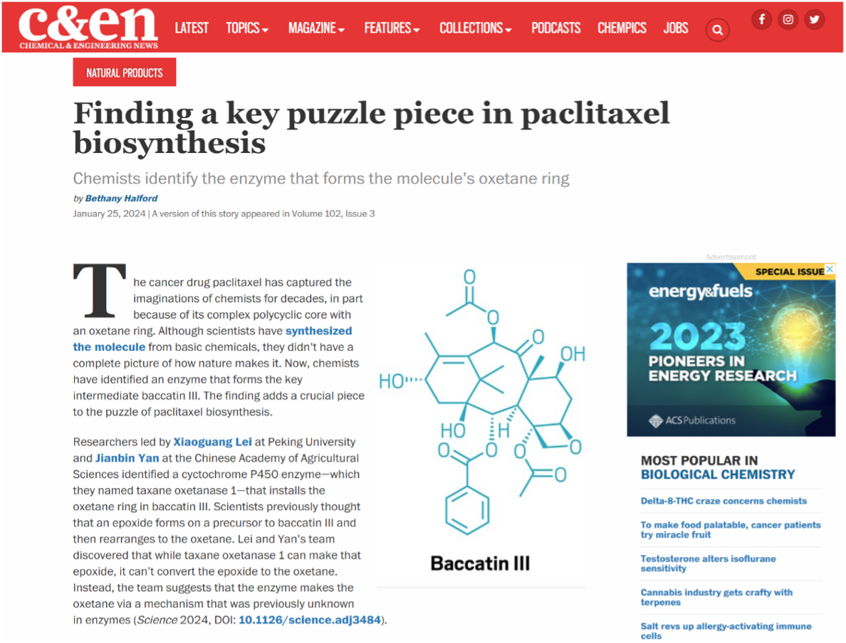 美国化学会官方杂志-化学化工新闻周刊《C&E News》新闻报道链接:Finding a key puzzle piece in paclitaxel biosynthesis (acs.org)