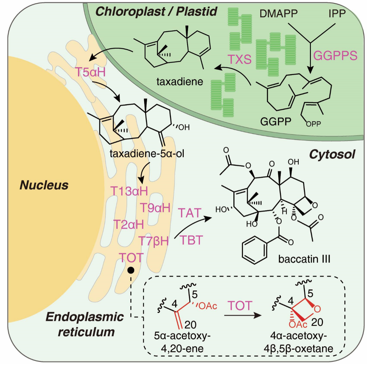 随着生物技术的快速发展,基于合成生物学的异源合成策略已发展成为解决复杂植物天然产物高效制备的有力手段,因此通过合成生物学的手段实现紫杉醇的高效、绿色和可持续生产受到了广泛的关注。然而,要实现紫杉醇在异源体系中的从头合成,必须要鉴定紫杉醇生物合成通路中所缺失的关键酶,打通紫杉醇完整的生物合成途径。