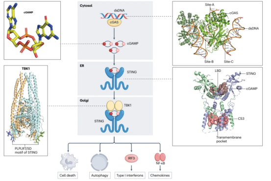 cGAS-STING信号通路是天然免疫系统的重要组成部分,它的发现回答了免疫学领域的一个重要问题:DNA如何激发天然免疫应答。2024年的拉斯克基础医学奖被授予了西南医学中心的陈志坚(James Chen)教授,表彰其发现了DNA感应蛋白cGAS,揭示了DNA触发免疫和炎症反应的机制。关于cGAS-STING信号通路的来龙去脉,免疫学领域的几位资深科学家也在《免疫》和《新英格兰医学杂志》上进行了清晰阐述【1, 2】。