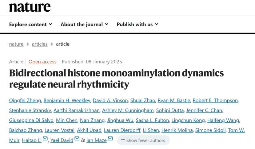 2025年1月8日,美国西奈山医学院Ian Maze、纪念斯隆凯特琳癌症中心Yael David和生命中心PI、清华大学李海涛教授合作在Nature杂志上在线发表了题为Bidirectional histone monoaminylation dynamics regulate neural rhythmicity的研究论文,首次报道了组蛋白组胺化修饰的生化调控机制及其在神经节律性调控中的作用。