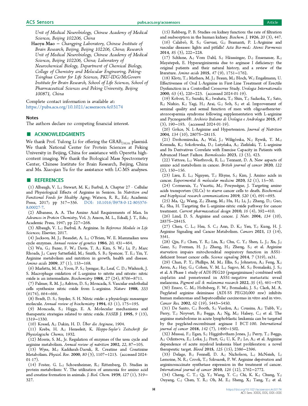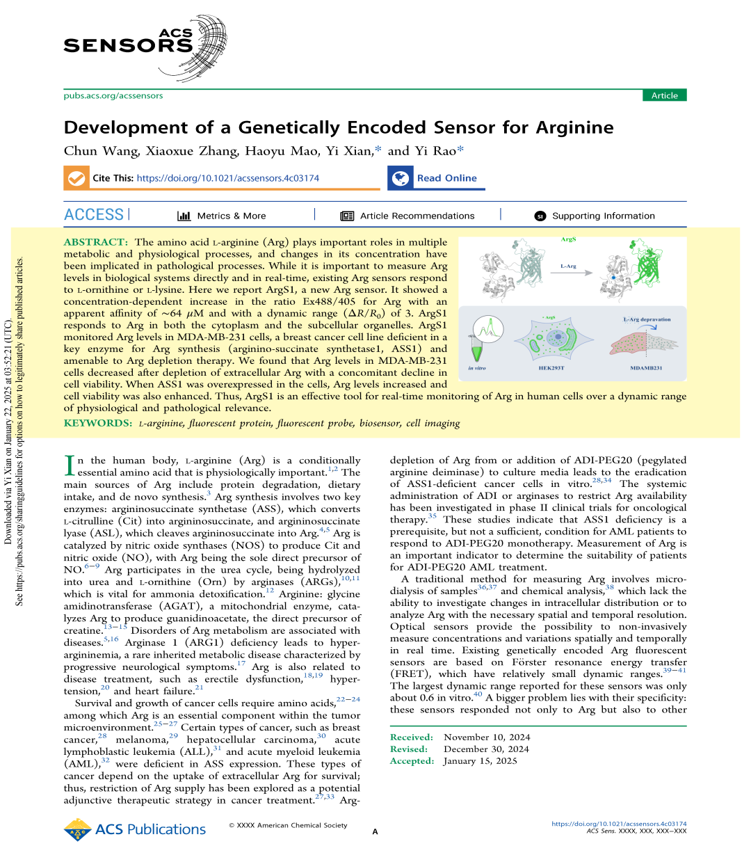 ACS Sensors期刊发表题为“Development of a Genetically Encoded Sensor for Arginine”的最新研究成果。本研究开发了一种新的Arg探针——ArgS1,可有效在生理和病理相关动态范围内实时监测人类细胞中的Arg水平。