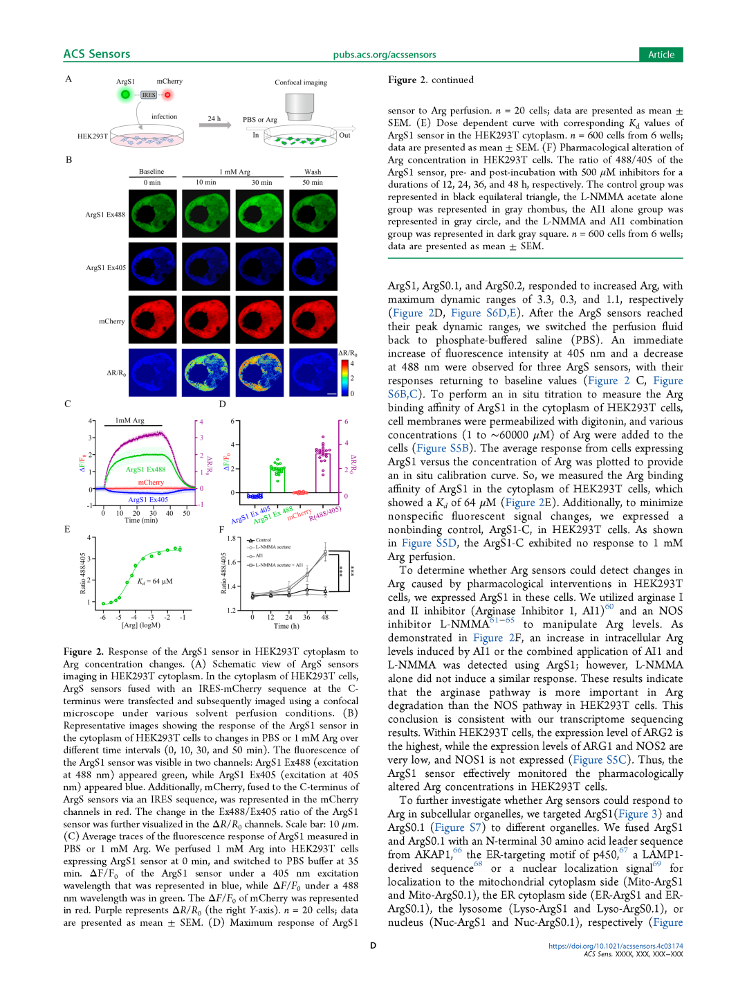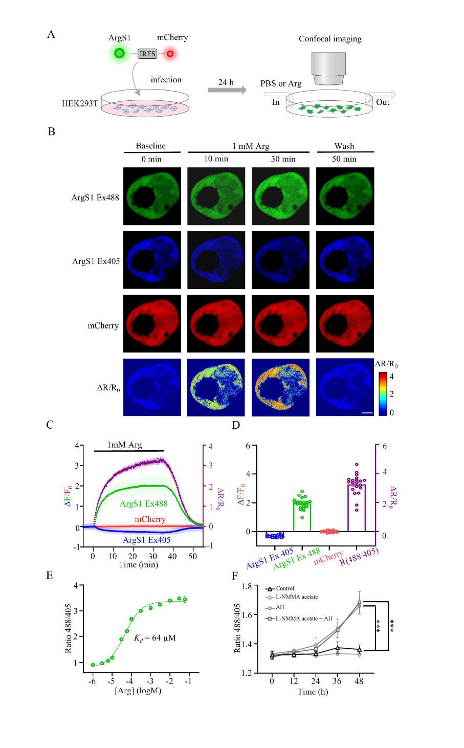 为了在HEK293T细胞质中进行原位滴定以测量ArgS1的Arg结合亲和力,我们用毛地黄皂苷(digitonin)透化细胞膜,并向细胞中添加不同浓度(1至∼60000 μM)的Arg(图S5B)。通过绘制表达ArgS1的细胞平均响应与Arg浓度的关系,获得了原位校准曲线。因此,我们测量了ArgS1在HEK293T细胞质中的Arg结合亲和力,其Kd值为64 μM(图2E)。此外,为了最小化非特异性荧光信号变化,我们在HEK293T细胞中表达了非结合对照探针ArgS1-C。如图S5D所示,ArgS1-C对1 mM Arg灌注无响应。