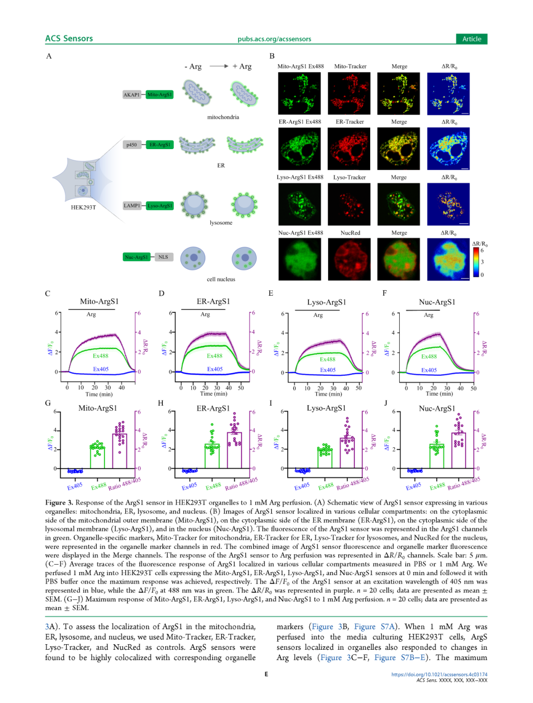 为了进一步研究Arg探针是否能够响应亚细胞器中的Arg,我们将ArgS1(图3)和ArgS0.1(图S7)靶向到不同的细胞器。我们将ArgS1和ArgS0.1分别与AKAP1的N端30个氨基酸引导序列[66]、p450的内质网(ER)靶向基序[67]、LAMP1衍生的序列[68]或核定位信号[69]融合,以定位到线粒体胞质侧(Mito-ArgS1和Mito-ArgS0.1)、ER胞质侧(ER-ArgS1和ER-ArgS0.1)、溶酶体(Lyso-ArgS1和Lyso-ArgS0.1)或细胞核(Nuc-ArgS1和Nuc-ArgS0.1)(图3A)。为了评估ArgS1在线粒体、ER、溶酶体和细胞核中的定位,我们分别使用Mito-Tracker、ER-Tracker、Lyso-Tracker和NucRed作为对照。结果显示,ArgS探针与相应的细胞器标记物高度共定位(图3B,图S7A)。当向培养HEK293T细胞的培养基中灌注1 mM Arg时,定位在细胞器中的ArgS探针也对Arg水平的变化作出了响应(图3C-F,图S7B-E)。Mito-ArgS1、ER-ArgS1、Lyso-ArgS1和Nuc-ArgS1探针的最大动态范围分别为3.7、3.8、3.2和3.8(图3G-J),而Mito-ArgS0.1、ER-ArgS0.1、Lyso-ArgS0.1和Nuc-ArgS0.1探针的最大动态范围分别为0.5、0.5、0.4和0.6(图S7F-I)。这些结果表明,ArgS探针在线粒体、ER和溶酶体附近区域以及细胞核内的响应相似。因此,我们成功开发了能够监测哺乳动物细胞质和亚细胞器中Arg的ArgS探针。