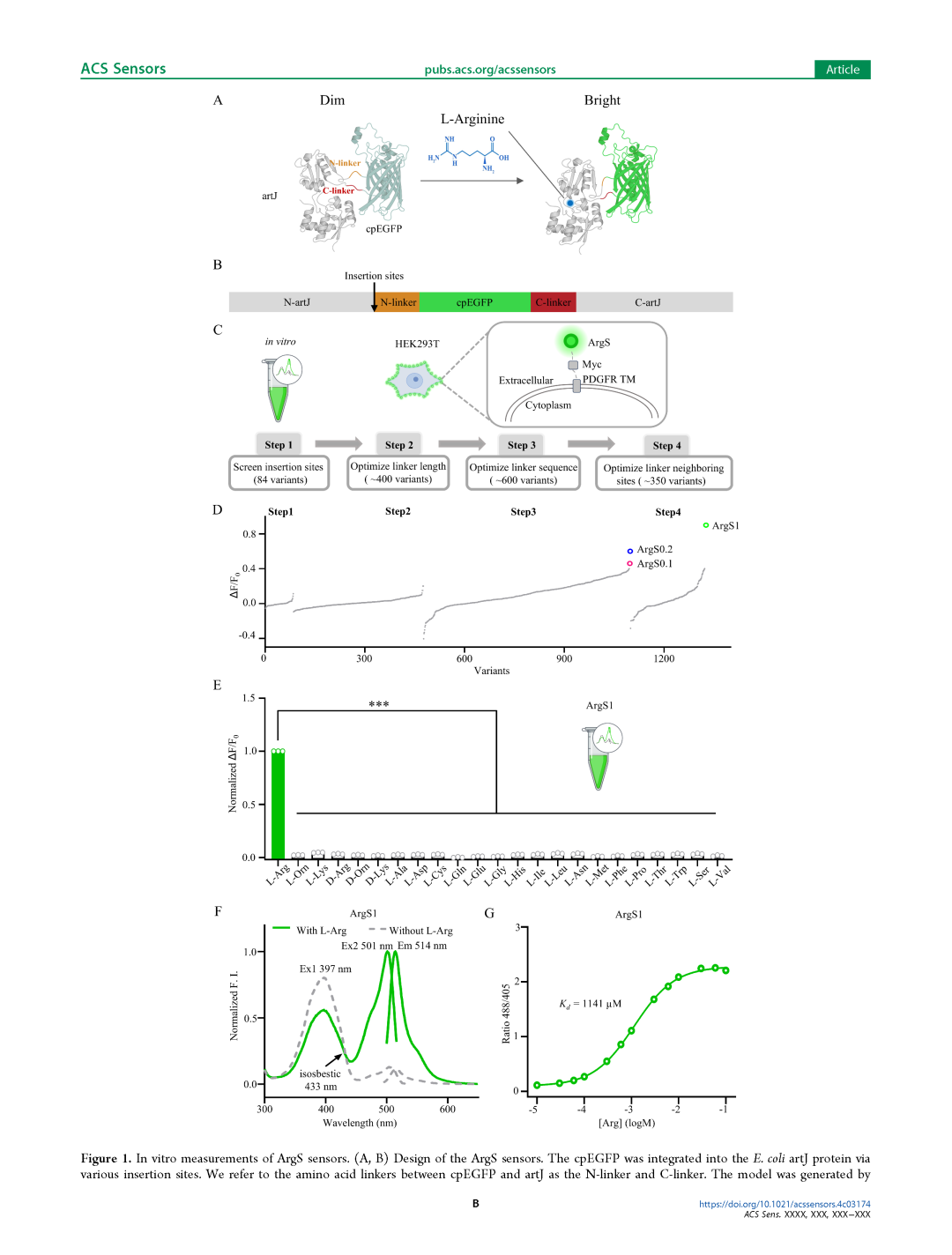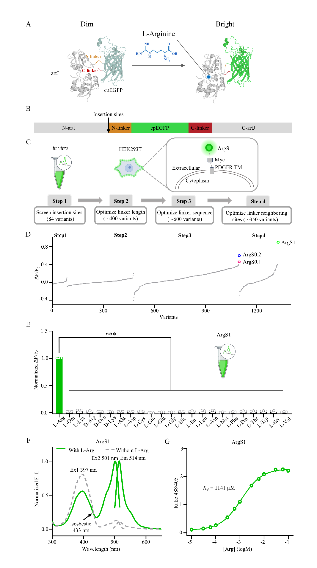 C ArgS探针的筛选流程。第1步是在纯化蛋白上进行插入位点筛选,第2至第4步是在HEK293T细胞膜上进行筛选,其中第2步和第3步分别优化连接肽的长度和组成,第4步优化连接肽邻近位点。