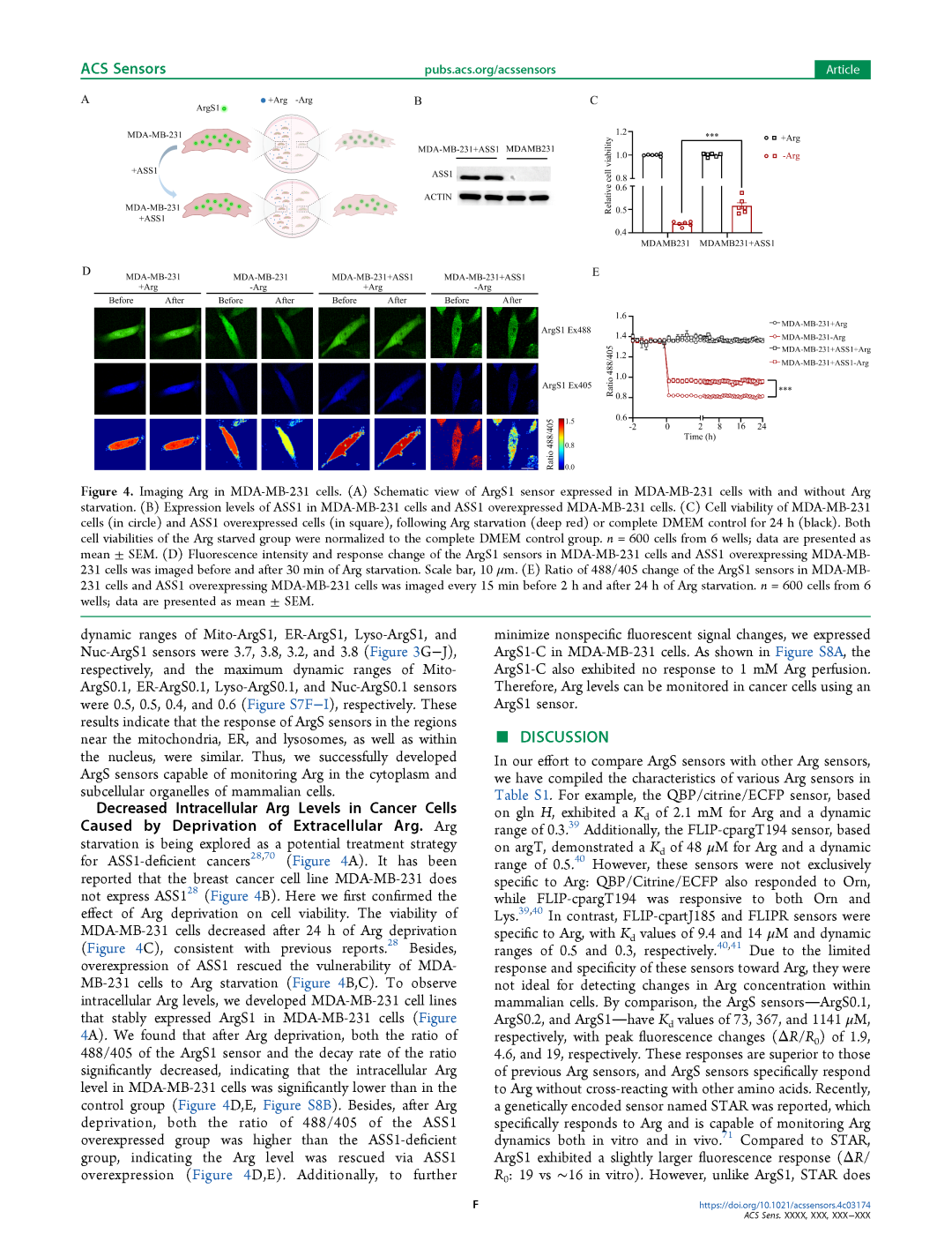 L-精氨酸(Arg)在多种代谢和生理过程中发挥重要作用,其浓度的变化与病理过程密切相关。尽管直接且实时测量生物系统中的Arg水平非常重要,但现有的Arg探针对L-鸟氨酸或L-赖氨酸也有响应。本文报道了一种新的Arg探针ArgS1。该探针对Arg表现出浓度依赖性的Ex488/405比率增加,其表观亲和力约为64μM,动态范围(ΔR/R0)为3。ArgS1在细胞质和亚细胞器中对Arg均有响应。ArgS1成功监测了MDA-MB-231细胞(一种缺乏Arg合成关键酶——精氨琥珀酸合成酶1(ASS1)的乳腺癌细胞系,且适用于Arg耗竭疗法)中的Arg水平。研究发现,当细胞外Arg被耗竭后,MDA-MB-231细胞中的Arg水平下降,同时细胞活力也随之降低。当细胞中过表达ASS1时,Arg水平上升,细胞活力也得到增强。因此,ArgS1是一种在生理和病理相关动态范围内实时监测人类细胞中Arg水平的有效工具。