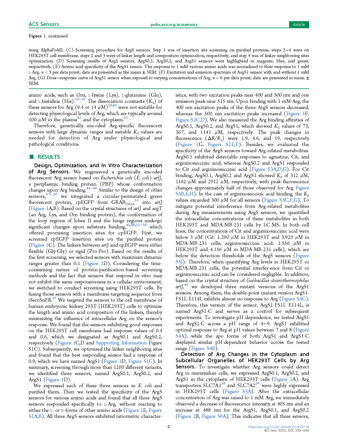 我们基于大肠杆菌(E. coli)的artJ(一种周质结合蛋白,PBP)设计了一种基因编码的荧光Arg探针。artJ在结合Arg时会发生构象变化[44-46]。与其他探针的设计类似[47-50],我们将来自GRABDA2m的环状置换绿色荧光蛋白(cpEGFP)[51]整合到artJ中(图1A、B)。根据artJ和argT(一种Arg、Lys和Orn结合蛋白)的晶体结构,其叶II的环区和铰链区在底物结合时会发生显著构象变化[45, 46, 52-56],这为cpEGFP的插入提供了潜在的位点。首先,我们在纯化蛋白上筛选了cpEGFP的插入位点(图1C)。artJ与cpEGFP之间的连接肽设计为柔性(Gly-Gly)或刚性(Pro-Pro)。基于初步筛选结果,我们选择了动态范围大于0.1的探针(图1D)。考虑到基于蛋白纯化的筛选方法耗时较长,且在体外响应的探针在细胞环境中可能表现不同,我们转而使用HEK293T细胞进行筛选。通过将探针与iSeroSnFR的膜靶向序列融合[57],我们将探针靶向到人胚胎肾293T(HEK293T)细胞的细胞膜上,以优化连接肽的长度和氨基酸组成,从而最小化细胞内Arg对探针响应的影响。我们发现,在HEK293T细胞膜上表现出良好响应的探针的响应值分别为0.4和0.6,分别命名为ArgS0.1和ArgS0.2(图1C、D,图S1C)。随后,我们优化了连接肽邻近位点,发现响应最佳的探针的响应值为0.9,命名为ArgS1(图1D,图S1C)。总结而言,通过对1200多种不同变体的筛选,我们最终确定了三种探针,分别命名为ArgS0.1、ArgS0.2和ArgS1(图1D)。