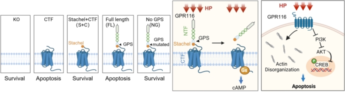 进一步深入解析了GPR116的力感应与信号转导机制。发现GPR116特异性地响应压力变化,而非剪切力、牵拉力或基质刚度的变化。在LSECs或HEK 293T细胞中过表达GPR116,能在压力下激活下游信号;反之,敲低GPR116则能有效保护细胞免受高压诱导的损伤,而其他已知的机械传感器如PIEZO1、PIEZO2和TRPV4则不具备此特性。当感受到压力时,GPR116发生自水解,激活下游Gs信号通路,进而引发细胞骨架紊乱,并抑制PI3K/Akt信号通路和CREB蛋白的磷酸化,最终导致细胞凋亡。