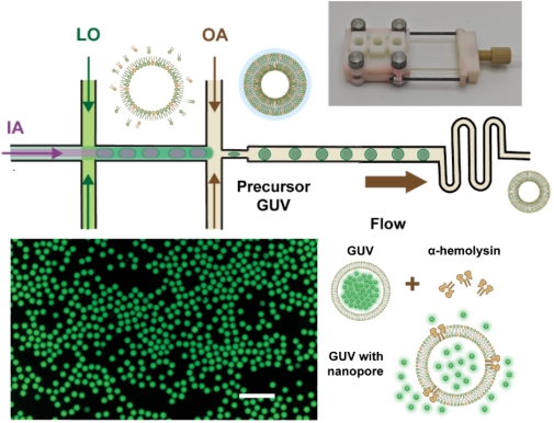 图2 基于微流控的微米囊泡制备系统,用于封装CFPS体系,并结合α-溶血素实现人工细胞的内外通讯