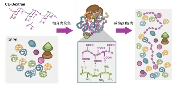 图1 CFPS在CE-Dex诱导下通过分子间作用力形成聚集体,关闭蛋白合成;在碱性pH作用下重新解离为溶液状态开启蛋白合成