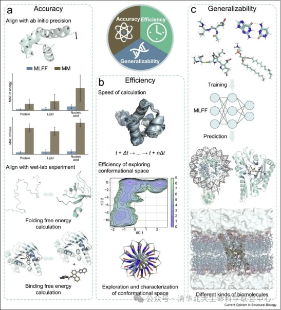 近年来,人工智能的兴起,如AlphaFold在蛋白质结构预测领域的突破,凸显了AI在计算结构生物学中的潜力。基于MLFF分子动力学模拟使用神经网络计算原子的受力并迭代更新位置和速度,能够追踪分子行为的时序演化,从而探查生物分子的复杂机制。