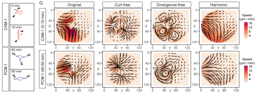 此外,借助IMEE技术,研究人员对Cx3cr1GFP+/-转基因胚胎小鼠大脑皮层中内源荧光标记的小胶质细胞进行了实时观测,并结合细胞形态变化构建向量场,进行了拓扑分解分析。结果显示,静息状态下的毛细血管相关小胶质细胞(Capillary-associated microglia, CAMs)与脑实质小胶质细胞(Parenchymal microglia, PCMs)在环境监视中表现出不同的动态行为模式,其中后者显示出更活跃的细胞突起伸缩运动。
