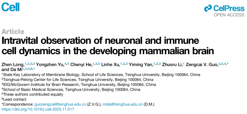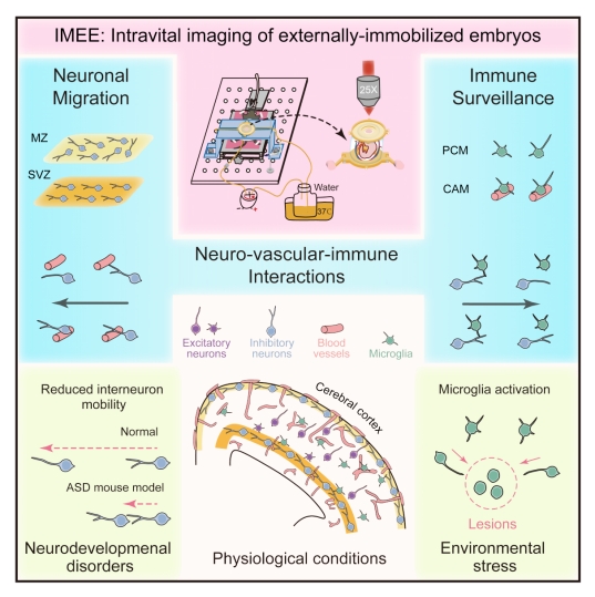 2025年12月16日,清华大学生命科学学院、清华-IDG/麦戈文脑科学研究院、生命科学联合中心、膜生物学全国重点实验室米达团队,与清华大学医学院、清华-IDG/麦戈文脑科学研究院、生命科学联合中心郭增才团队合作,在Cell发表了题为Intravital observation of neuronal and immune cell dynamics in the developing mammalian brain的研究论文。该研究开发了一种高稳定性、多视角、长时程的胚胎小鼠宫内活体成像技术(IMEE),首次在体阐明了胚胎小鼠大脑皮层内抑制性神经元与血管网络及小胶质细胞间的动态互作模式。研究还为神经发育性疾病模型小鼠中神经元迁移异常提供了全新在体证据,同时解析了胚胎免疫细胞在响应环境压力时的动态行为模式。这项工作突破了传统胚胎神经成像的技术瓶颈,为解析大脑发育过程中的神经-血管-免疫系统互作机制与协同发育机制开辟了全新的研究范式,凸显了胚胎活体成像技术在神经科学与脑疾病研究中的重要价值。