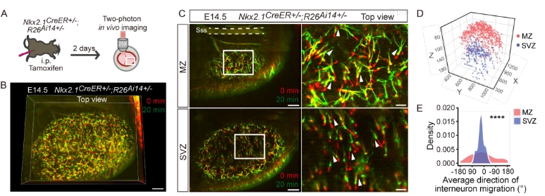 利用不同品系的转基因小鼠内源荧光标记或小鼠胚胎电转技术,研究人员标记了胚胎小鼠大脑皮层内的兴奋性或抑制性神经元,并结合IMEE成像,系统性地鉴定了不同类型神经元的个体与群体迁移模式。结果显示,源于背侧端脑的新生兴奋性神经元通过多极化迁移(Multipolar migration)、位移运动(Locomotion)及胞体转运(Somal translocation)方式在大脑皮层中进行径向迁移;而产生于腹侧端脑的抑制性神经元则分别通过异质或同质方向扩散模式于皮层边缘区(Marginal zone,MZ)或脑室下区(Subventricular zone,SVZ)进行切向迁移。