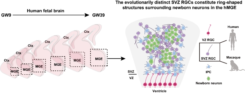 哺乳动物大脑皮层抑制性神经元主要起源于腹侧端脑中的内侧神经节隆起(MGE)。研究团队综合应用空间转录组与单细胞转录组测序技术,系统描绘了人类妊娠第9周到第39周MGE脑区的发育景观。该研究首次在人类胎儿MGE脑区中发现一类新型神经干细胞类型(SVZ RGC),其在分子标记、空间分布与分裂行为上均与之前报道过的神经干细胞类型具有明显区别。跨物种比较分析显示,SVZ RGC普遍存在于灵长类大脑中,但在小鼠大脑中未见同源类型。功能验证实验显示,SVZ RGC在人类胎儿期持续产生抑制性神经元和神经胶质细胞,揭示SVZ RGC是人类大脑抑制性神经元数量与比例增多的关键细胞基础。