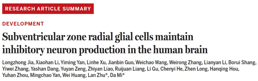 2026年1月15日,生命中心/清华大学米达团队联合中国医学科学院北京协和医院朱兰院士团队在《科学》(Science) 发表了一项突破性研究“脑室下区放射状胶质细胞维持人脑抑制性神经元的持续产生” (Subventricular zone radial glial cells maintain inhibitory neuron production in the human brain)。该研究聚焦人脑动态发育过程,基于珍贵样本系统绘制了人类大脑内侧神经节隆起(MGE)脑区的细胞发育图谱,首次在人类胎儿大脑中发现了一类独特的神经干细胞类型—— SVZ RGC (脑室下区放射状胶质细胞),并揭示SVZ RGC在人类妊娠期中持续产生抑制性神经元和神经胶质细胞,从而增加了人类大脑皮层抑制性神经元的数量及比例。这项研究为深入理解人类特有的大脑抑制性神经元发育机制和在进化上大脑皮层扩张机制提供了重要理论基础。鉴于抑制性神经元的功能缺陷与癫痫、自闭症等多种神经系统疾病密切相关,这类新型神经干细胞的发现将为未来相关疾病的潜在干预策略开辟新的方向。