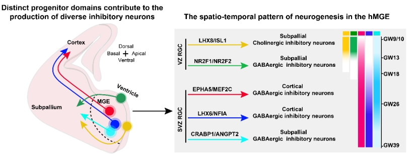 人类大脑神经元的惊人多样性是支撑高级脑认知功能的根本基石。人类大脑中数量巨大、种类繁多的神经元是如何由数量和种类都相对有限的神经干细胞有序产生的,是神经科学领域的核心科学问题。本研究系统绘制了人类胎儿MGE脑区的神经发生时空图谱,揭示了人类大脑抑制性神经元多样性产生的核心机制。研究发现人类MGE中存在高度区隔化的神经祖细胞域(progenitor domain),并且该祖细胞域与多种抑制性神经元谱系之间具有明确对应关系。同时,研究揭示人类MGE中的神经发生具有严格的时空规律:发育早期,位于脑室区(VZ)的LHX8/ISL1+和NR2F1/NR2F2+祖细胞域率先进行神经发生;发育后期,位于脑室下区(SVZ)的EPHA5/MEF2C+,CRABP1/ANGPT2+和LHX6/NFIA+祖细胞域成为了主要的神经发生场所。这些结果表明,在人类大脑发育过程中部分抑制性神经元类型的身份早在祖细胞阶段就已建立,并受到其“出生地”和“出生时间”的严格限制。