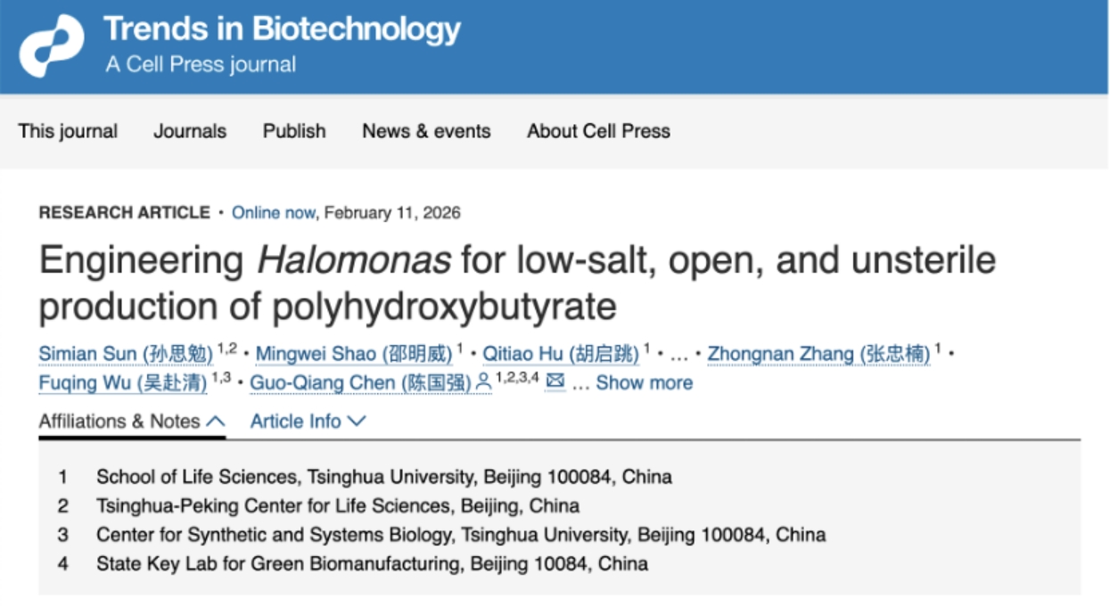 2026年2月11日,生命中心、清华大学生命科学学院陈国强课题组在《生物技术趋势》(Trends in Biotechnology)上在线发表了题为“工程化改造盐单胞菌实现低盐条件下的开放式非无菌聚羟基丁酸合成”(Engineering Halomonas for Low Salt Open Unsterile Production of Polyhydroxybutyrate)的研究论文。