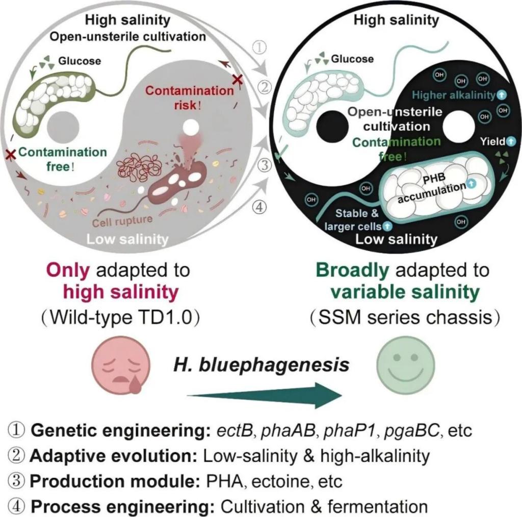 陈国强教授团队从野生环境中分离得到耐盐碱的嗜盐菌(Halomonas spp.)天然菌株,开展了二十年余年系统攻关,成功创制出具有完全自主知识产权的新型底盘细胞——Halomonas bluephagenesis TD系列及其衍生菌株,实现在开放条件下连续发酵,彻底规避灭菌环节,显著降低能耗与设备成本,在国际上首次提出并建立了基于极端微生物的下一代工业生物技术(NGIB)。然而,嗜盐菌底盘依赖较高盐度(通常30-60 g/L NaCl)以维持细胞生理稳态与代谢活性。这一高盐依赖在一定程度上限制了其在更低盐、更灵活工艺体系中的应用拓展,也增加了后续废水处理与环境负荷。如何在保持开放非无菌培养优势的同时,降低嗜盐菌对高盐环境的依赖,从而构建更节能、更低碳、更普适的国产自主生物制造平台,是该领域亟需突破的核心科学问题。针对上述挑战,陈国强课题组采用迭代工程化改造策略,系统优化菌株的低盐适应性,成功构建了在仅含0.1%(w/v)NaCl条件下仍可稳健生长的SSM系列工程菌株。本研究围绕该系列菌株的构建逻辑、低盐适应机制及其生物合成性能展开系统阐述,为嗜盐菌底盘的精细化工程改造提供新范式,也为我国自主知识产权工业菌株的深度优化与产业化应用奠定理论依据与技术储备。