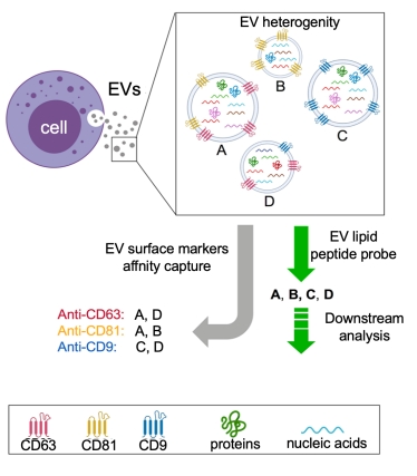 图3. 如针对EV的表面蛋白进行免疫捕获,会因为EV的异质性得到不同的亚群,难以合理的对EV进行富集。针对膜的多肽探针捕获策略可以从另一个维度纵向富集EV。
