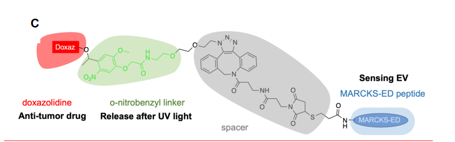 4.在肽序列中偶联生物正交反应基团(如叠氮、炔基),实现了与荧光基团、亲和标签或固体载体的精准、高效耦联,并用于体内靶向递送药物,构建用于成像、捕获、药物负载的多功能探针。团队构建光激活的MARCKS-ED-Photodox。该前药利用肽的EV靶向能力,富集于肿瘤微环境;在近紫外光照射下,可控释放活性药物分子。这首次实现了利用曲率感知肽进行时空可控的靶向化疗,为癌症治疗提供了新策略。