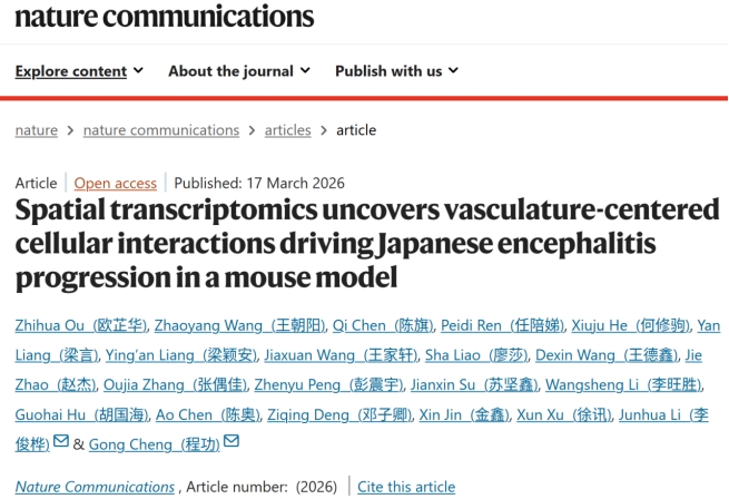生命中心/清华大学程功教授课题组与华大生命科学研究院李俊桦研究员课题组合作,利用定制化的Stereo-seq空间转录组学芯片和小鼠模型,构建了从JEV侵染脑部到引发广泛炎症及组织损伤的高精度时空图谱,发现脑血管系统,尤其是脑膜区域,是病毒感染后的炎症与细胞死亡枢纽,并且脑膜Ackr1⁺内皮细胞和Ly6c2⁺单核细胞协同促进病毒扩散,加重脑部炎症。研究成果于3月17日在Nature Communications期刊在线发表(图1)。
