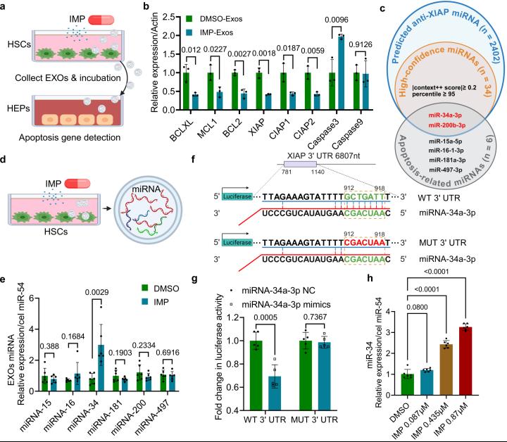 围绕这一发现,研究团队进一步解析了分子机制。结果表明,Imipramine作用于肝星状细胞后,可激活p53/hnRNPA2B1/DGCR8信号轴,促使miR-34a-3p被选择性富集到肝星状细胞分泌的外泌体中。这些外泌体随后被肝细胞摄取,将 miR-34a-3p 递送至受体细胞内,并抑制抗凋亡分子XIAP表达,最终激活 caspase-3 通路,引发肝细胞凋亡。
