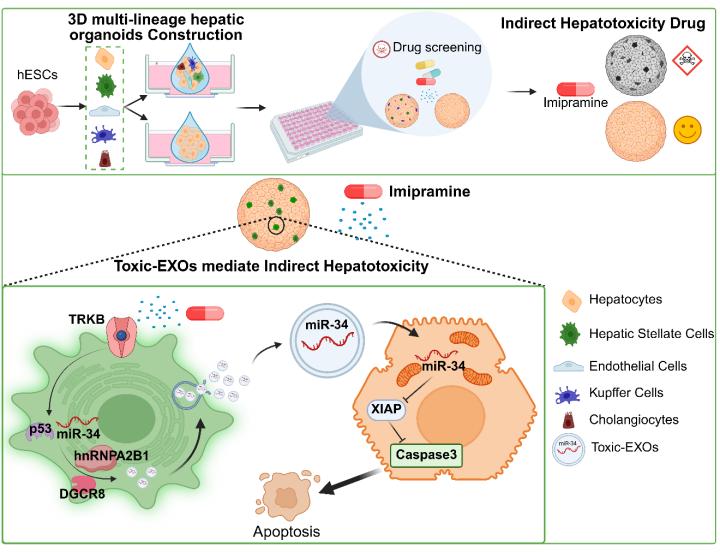 多谱系肝类器官揭示“毒性外泌体”跨细胞毒性机制示意图