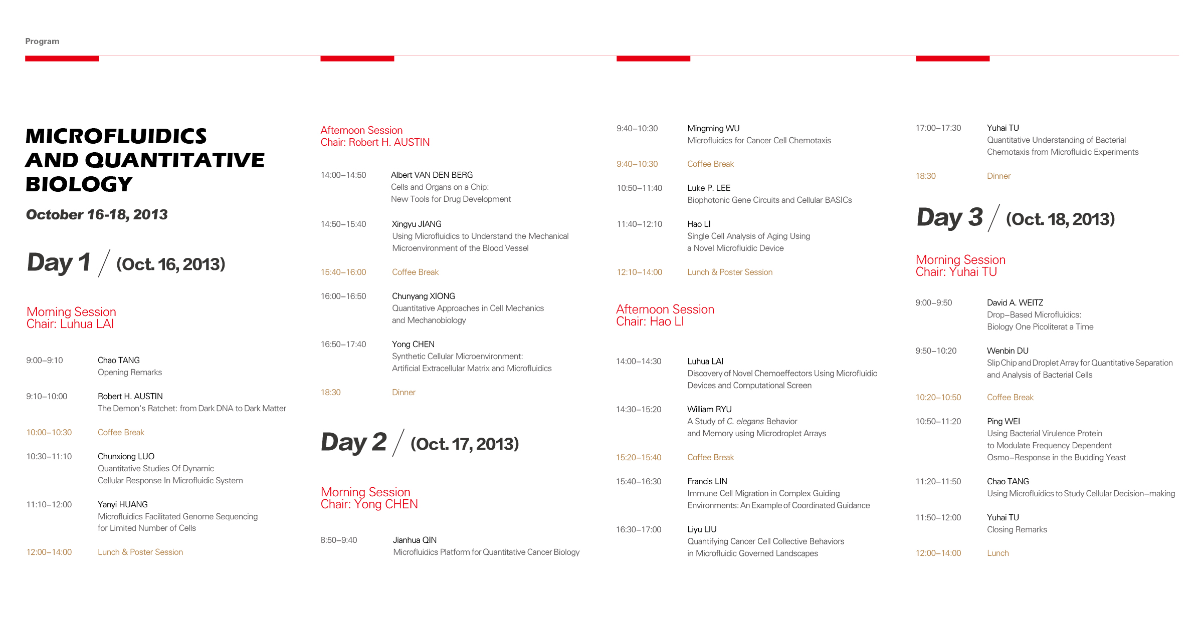 欢迎参加2013年10月16-18日,由北京大学定量生物学中心举办的主题为“微流和定量生物学”的国际学术研讨会。会议邀请了在此新兴领域中的顶级专家,共同探讨微流前沿领域中的最新技术发展及其应用,如怎样解决如细胞运动性,细胞周期、老化,细胞重组和癌症等各方面生物学问题;交流各自在领域中的专长与进展,分享对微流技术在定量生物学中发展方向和及如何解决其面对的可能挑战。