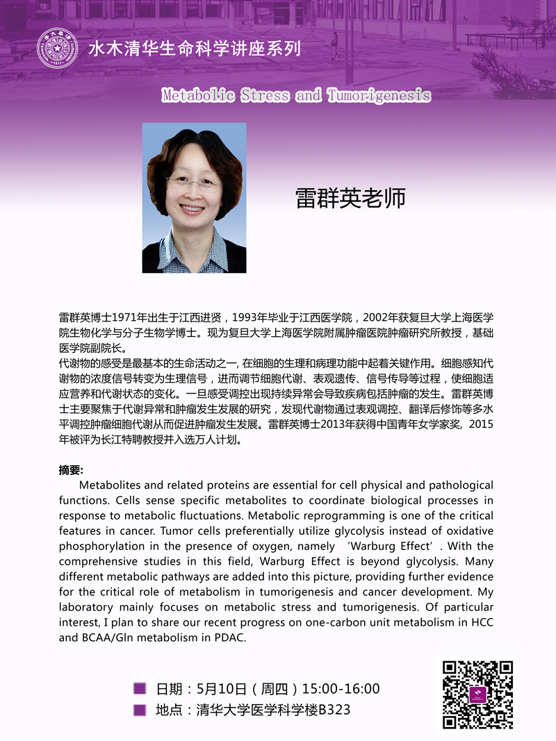 代谢物的感受是最基本的生命活动之一, 在细胞的生理和病理功能中起着关键作用。细胞感知代谢物的浓度信号转变为生理信号,进而调节细胞代谢、表观遗传、信号传导等过程,使细胞适应营养和代谢状态的变化。一旦感受调控出现持续异常会导致疾病包括肿瘤的发生。雷群英博士主要聚焦于代谢异常和肿瘤发生发展的研究,发现代谢物通过表观调控、翻译后修饰等多水平调控肿瘤细胞代谢从而促进肿瘤发生发展。雷群英博士2013年获得中国青年女学家奖, 2015年入选万人计划。
