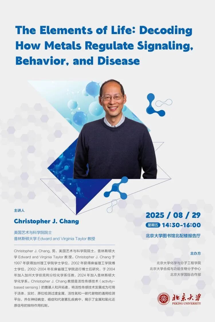 Christopher J. Chang, 男,美国艺术与科学院院士,普林斯顿大学Edward and Virginia Taylor教授。Christopher J. Chang于1997年获得加州理工学院学士学位,2002年获得麻省理工学院博士学位,2002-2004年在麻省理工学院进行博士后研究,于2004年加入加州大学伯克利分校化学系任教,2024年加入普林斯顿大学化学系。Christopher J. Chang教授是活性传感技术(activity-based sensing)的奠基人和开拓者,将活性传感技术发展成为可用于活体、实时、原位检测过渡金属、活性氧和一碳代谢物的通用检测平台,并在神经病变、癌症和代谢紊乱疾病中,揭示了金属和氧化还原信号的独特作用机制。