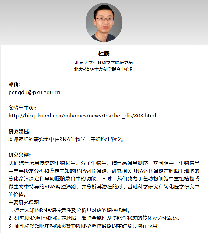 北京大学杜鹏实验室依托于北京大学生命科学学院、北大-清华生命科学联合中心、北京大学核糖核酸北京研究中心(BEACON)。从事RNA调控、干细胞及肿瘤生物学的相关研究。主要致力于分析和鉴定未知的RNA调控通路,并研究相关RNA调控通路在胚胎干细胞的分化命运决定和早期胚胎发育中的功能。同时,我们也尝试于在动物细胞中重组植物或微生物中特异的RNA调控通路,并研究其潜在的转化医学中的应用。