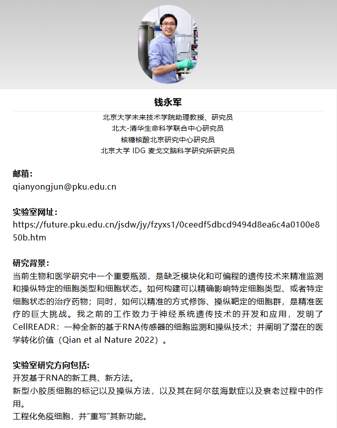 北京大学未来技术学院钱永军课题组校内外公开招聘课题组科研助理岗1人。